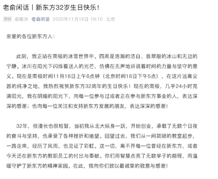 11月16日,新东方迎来32周年,创始人俞敏洪身处南极向全体员工发出一封全员信。信中提到,“此刻,我正站在南极的冰雪世界中。四周是浩瀚的洁白、翡翠般的冰山和无边的宁静。冰川在阳光下闪烁着迷人的光芒,仿佛在无声地诉说着时间的力量与坚守的意义。现在是南极时间11月16日上午6点钟(北京时间16日下午5点),在这片远离尘嚣的纯净之地,我热烈祝贺新东方32周年的生日快乐!”